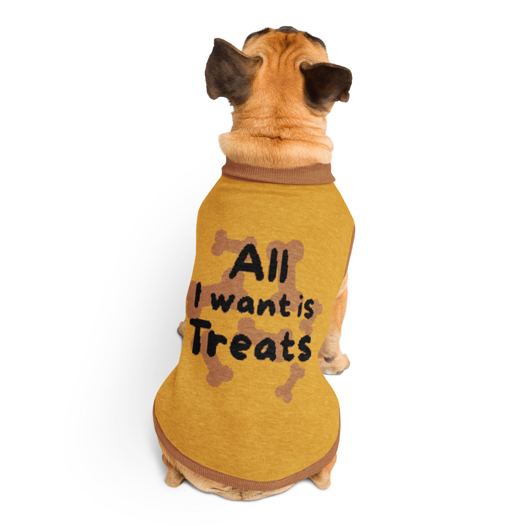 "All I Want Is Treats" Knitted Dog Sweater | Brown & Mustard Pet Pullover Back-Print